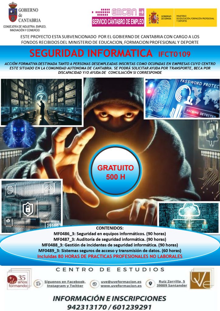 SEGURIDAD INFORMÁTICA ¡¡¡COMIENZO: 1 de OCTUBRE 2025!!! MODALIDAD: Presencial. 405 HORAS DE FORMACIÓN Y 125 DE PRÁCTICAS PROFESIONALES EN EMPRESA. HORARIO MAÑANA: De LUNES a VIERNES y en HORARIO de 8:30 a 12:45. CURSO GRATUITO CON BECA DE TRANSPORTE, POR DISCAPACIDAD Y/O CONCILIACIÓN FAMILIAR SI CORRESPONDE. DESCARGA EL PROGRAMA PINCHANDO ... Más info y suscripción